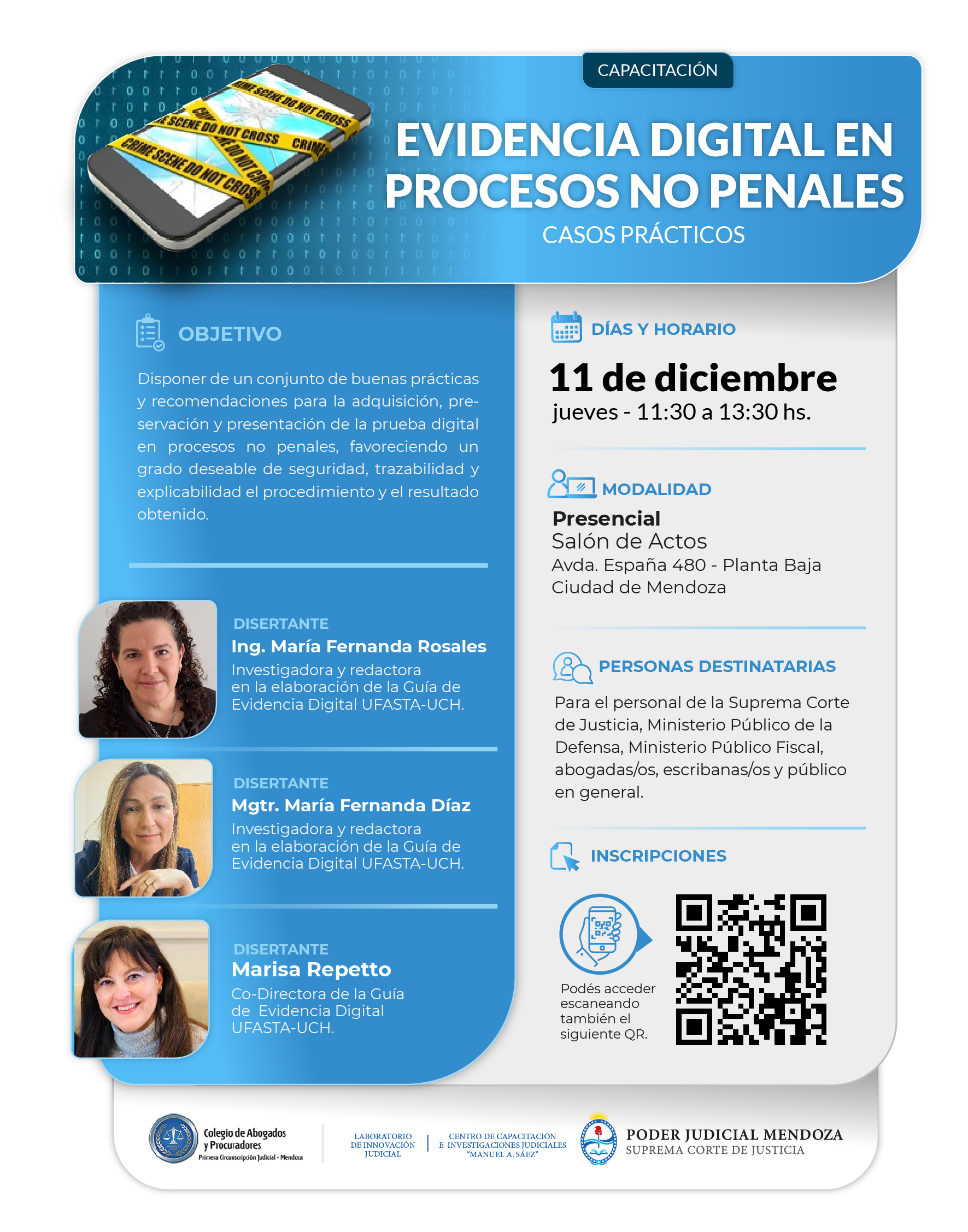 El encuentro contó la presencia de oradores nacionales e internacionales que realizaron valiosos aportes profesionales. Disertaron la Dra. Marina Marmolejo, Jueza Federal del Distrito Sur de Texas; la Dra. Micaela Álvarez, Jueza Federal de San Antonio (Texas); el Dr. Alejandro Cascio, Juez de la Cámara de Apelaciones del Departamento Judicial de Quilmes (Buenos Aires); y el Dr. Matías Deane, Juez del Tribunal en lo Criminal N.º 5 de La Matanza (Buenos Aires). Cada expositor ofreció perspectivas nacionales e internacionales orientadas a mejorar la práctica del sistema acusatorio y la interacción con el jurado.