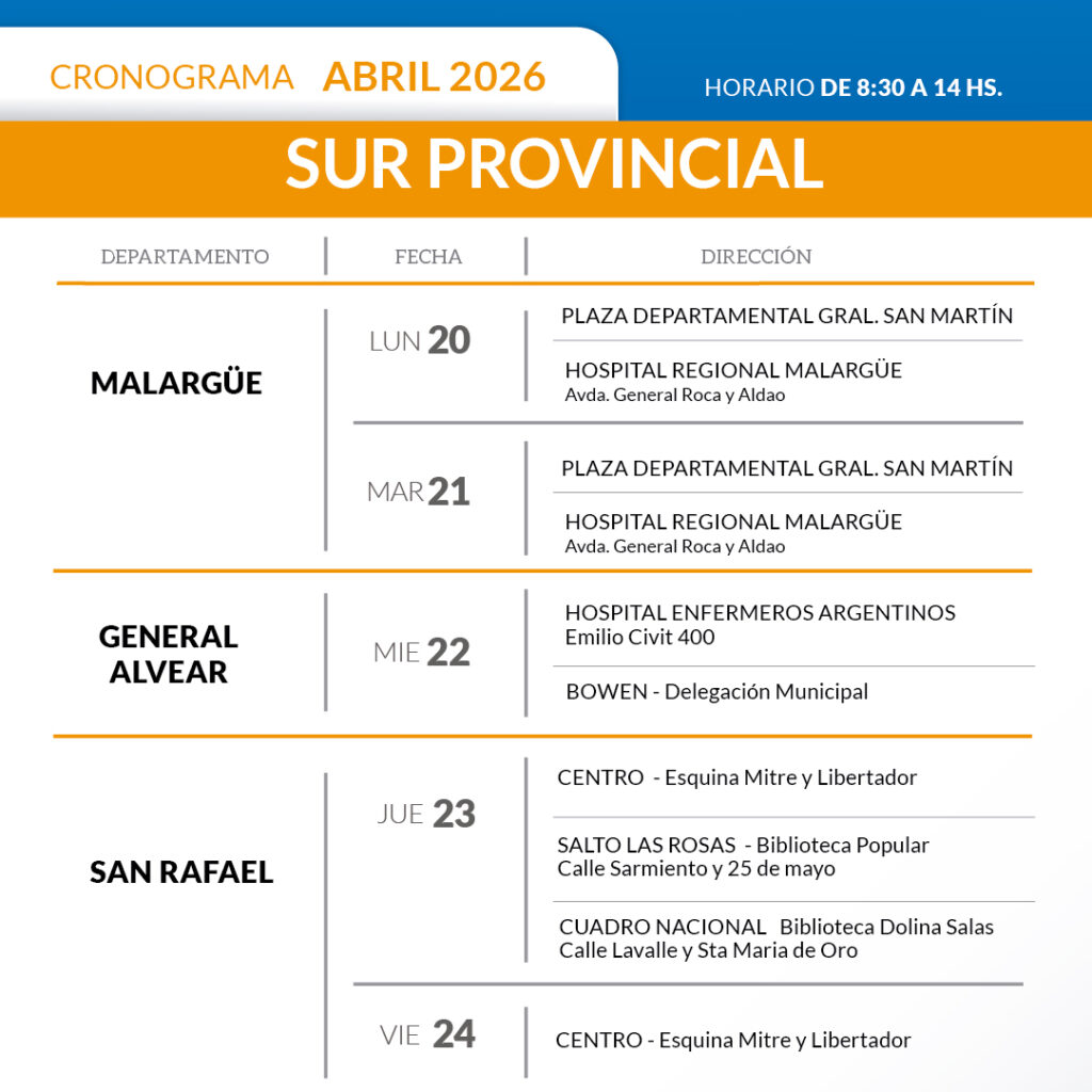 La semana del 20 al 24 de abril estará 2 días en Malargüe, 1 día en General Alvear y 2 días en San Rafael. No se entregan turnos y se atiende por orden de llegada de 8:30 a 14 hs.