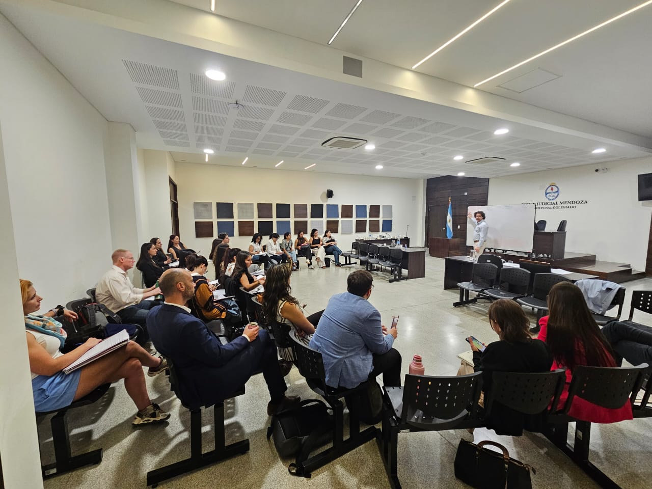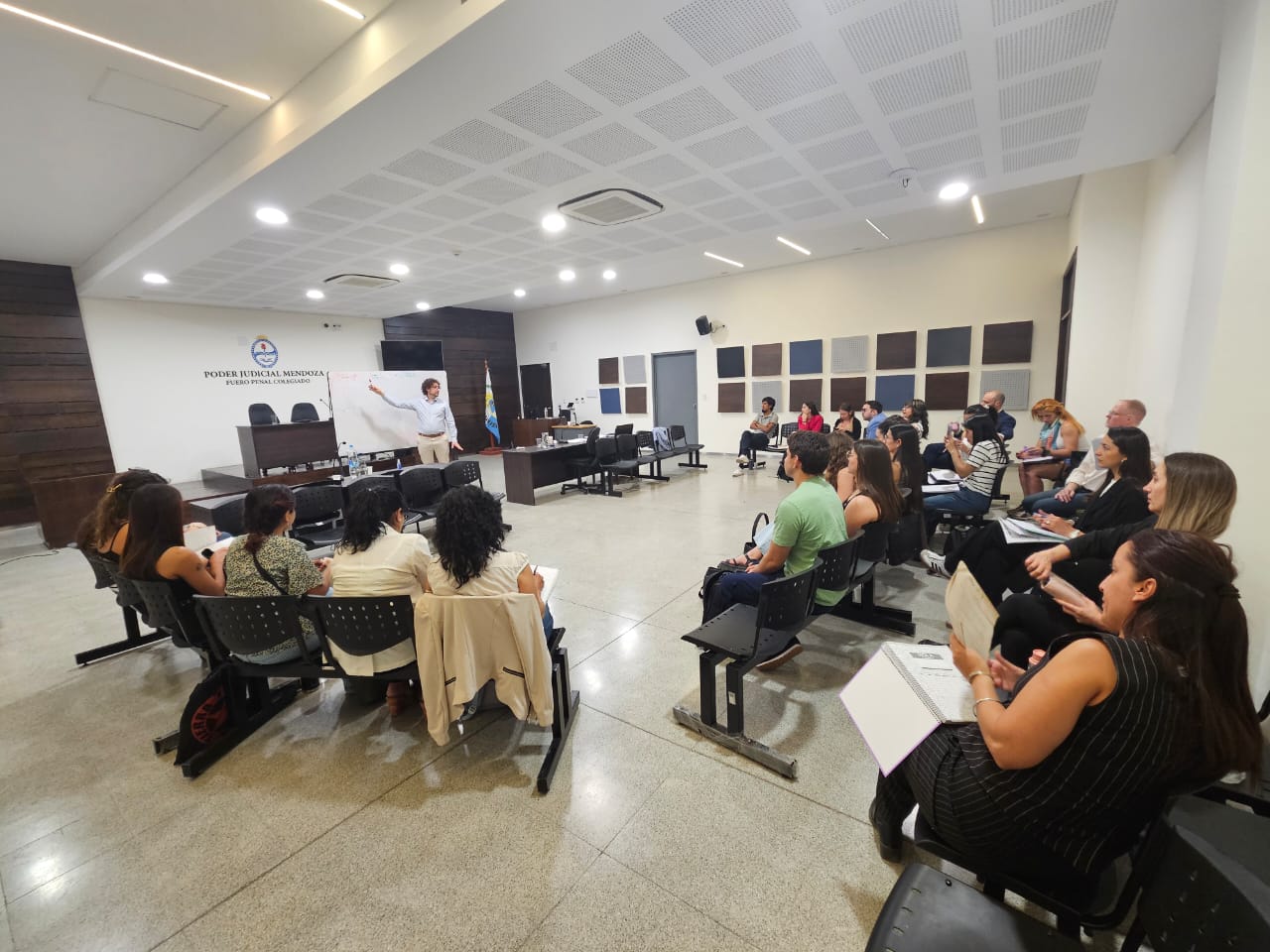 Los talleres en nuestra provincia se realizaron los días 3 y 4 de octubre en las salas de audiencias del Fuero Penal Colegiado en el Polo Judicial Penal de la Ciudad de Mendoza. El evento congregó a 29 abogados y abogadas comunitarias seleccionados para esta beca de formación. La modalidad presencial permitió profundizar en el ejercicio práctico del litigio frente a jurados mediante la simulación de un caso especialmente diseñado para la capacitación.