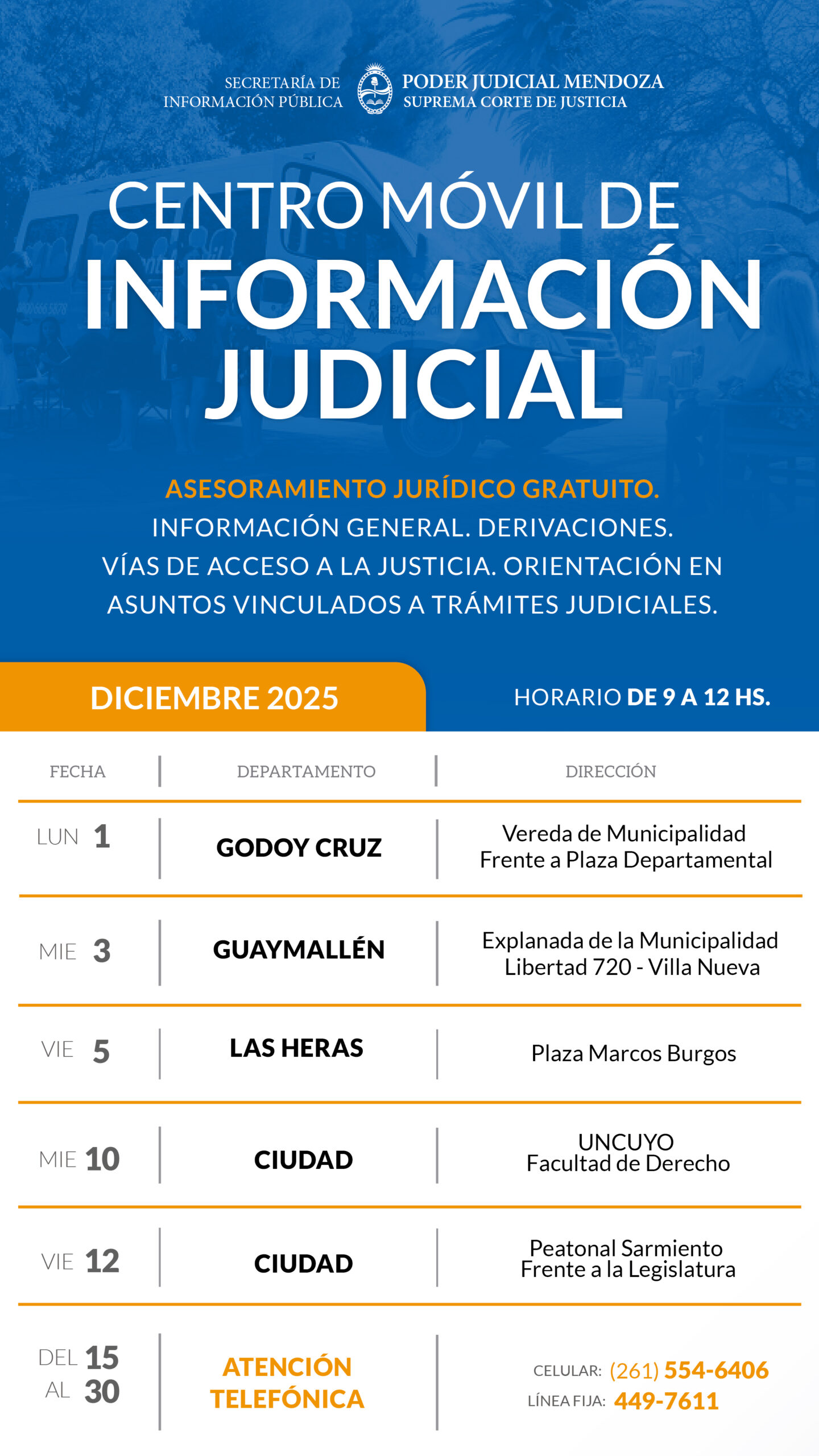 Se suspende recorrido Móvil Judicial del día 30/06/2025, solo atención telefónica al (261) 5546406 o 4497611